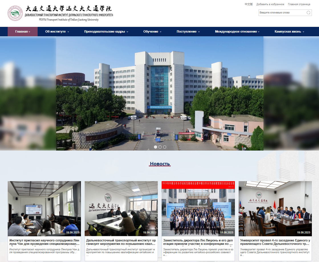 (Об институте)、探探(Пресс-центр)、师资力量(Преподавательские кадры)、人才培养(Обучение)、招生工作(Поступление)、国际合作(Международные сотрудничества)、校园生活(Студенческая жизнь)等特色板块,系统呈现学院在人才培养、国际化办学、社会服务等方面的综合实力及办学成果,为俄语世界打开一扇了解远交大的全新窗口。
